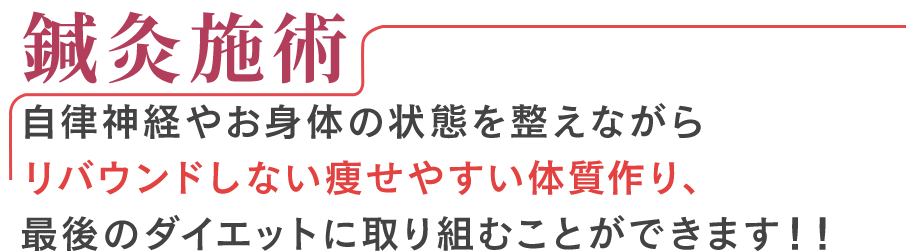 当院のダイエットプログラムは食欲を抑えるツボを刺激し、お身体への施術で自律神経を整えながらダイエットに取り組むことができます!運動ができない、またはしたくないという方でもおすすめです!